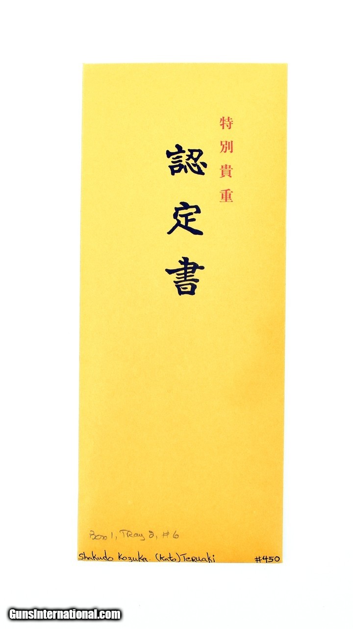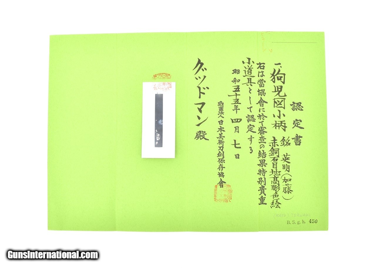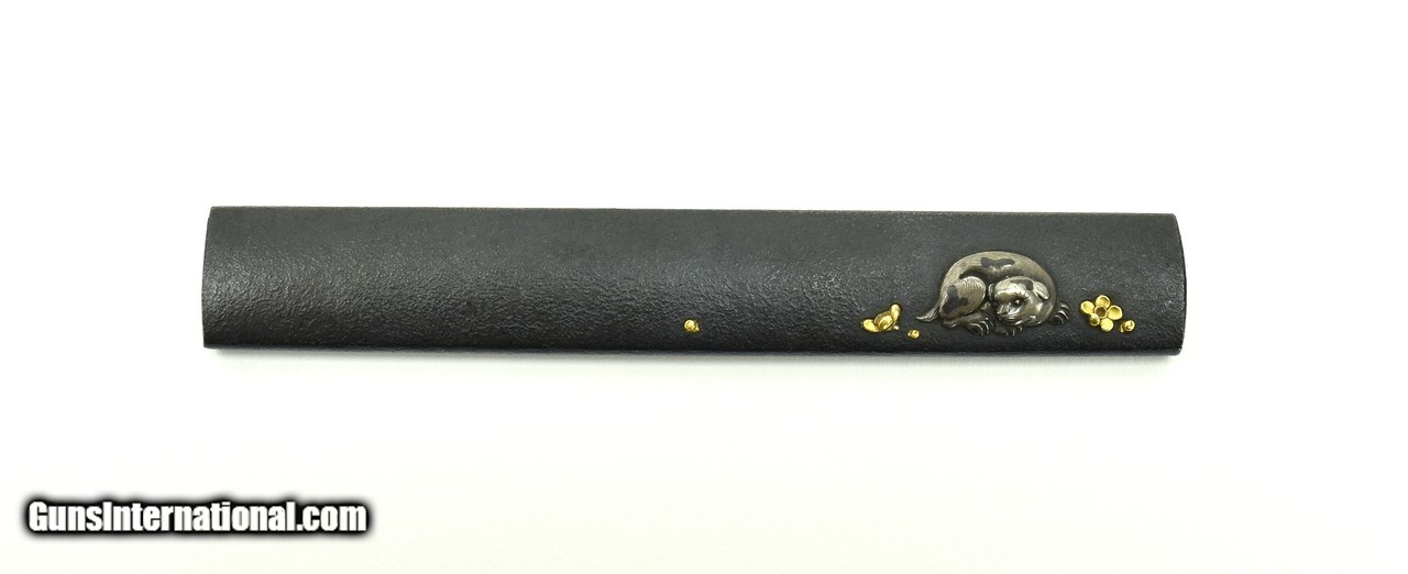 Description: "Kinko Kodzuka. Shakudo stone ground silver puppy with shakudo highlights gold flowers around the puppy. Reverse is decorated with flowers and grass. Background is lightly textured on front side. Very small signature on reverse. Signed: Teru Aki Family name Kato. Mid 19th century. Pupil of Ishiguro Masa Aki. Baur, P. 397 (534). SOLD |