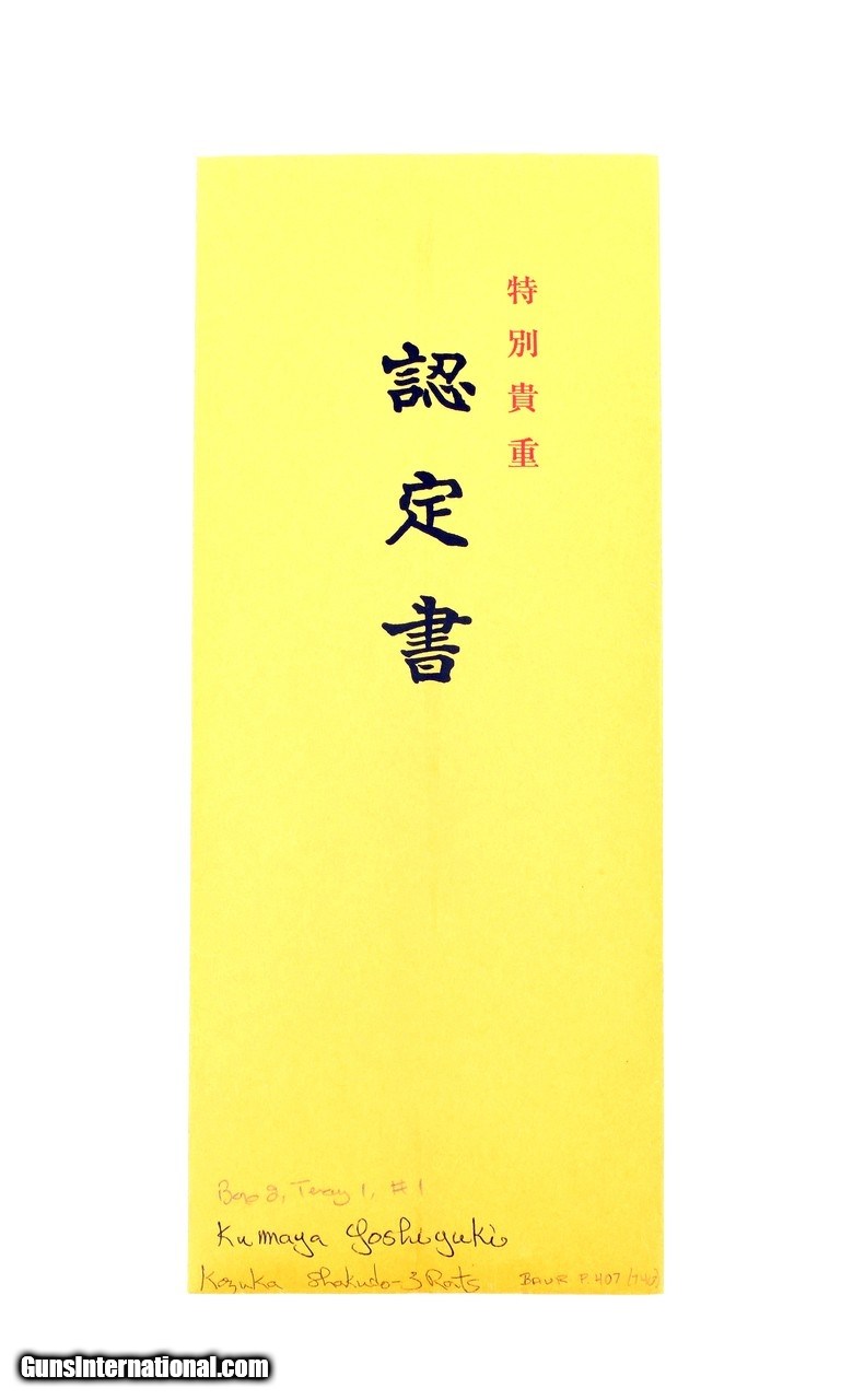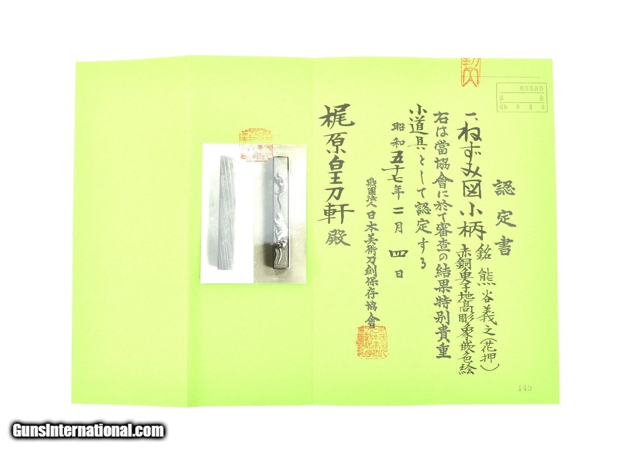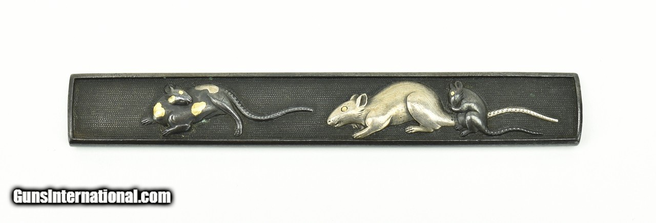 Description: "Kinko Kodzuka. Shakudo nanako ground. High relief of three rats with gold, silver and shakudo highlights. Signed: Kumaya Yoshi Yuki. Mid 19th century. Baur, P. 407 (740). N.B.T.H.K. certificate. The rats are a sign of wealth and prosperity (no food, no rats). First rat is shakudo with gold eye. The second is silver. All in high relief. Fine kodzuka! SOLD |