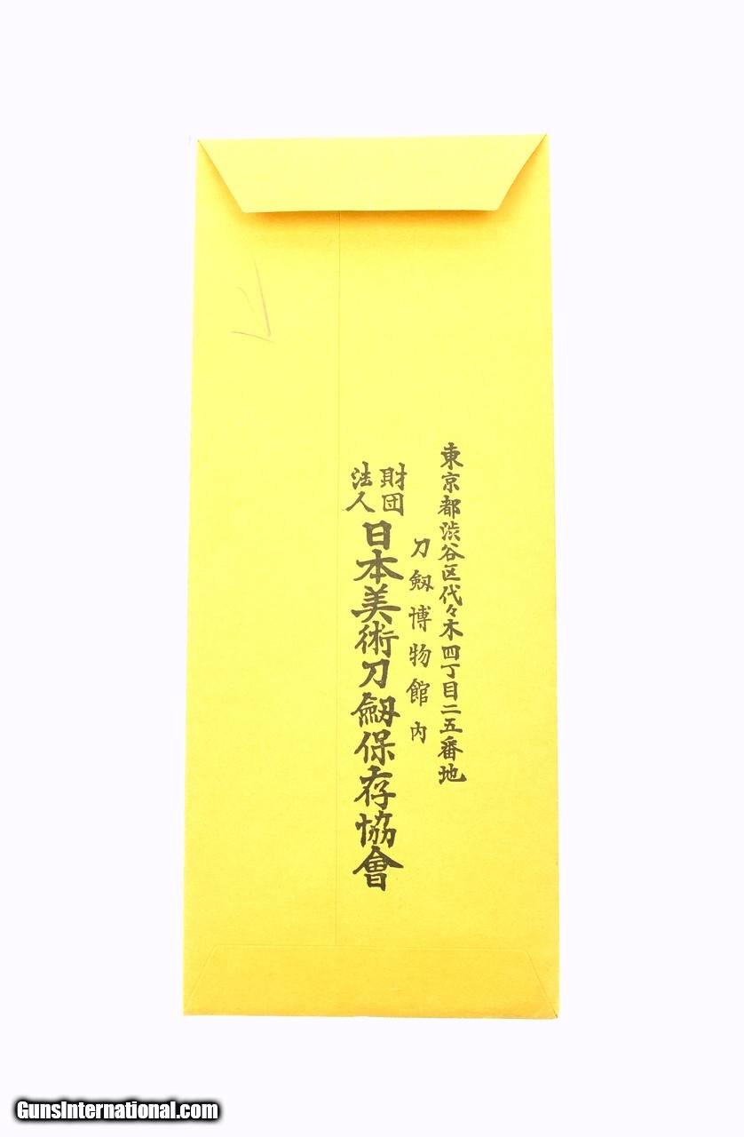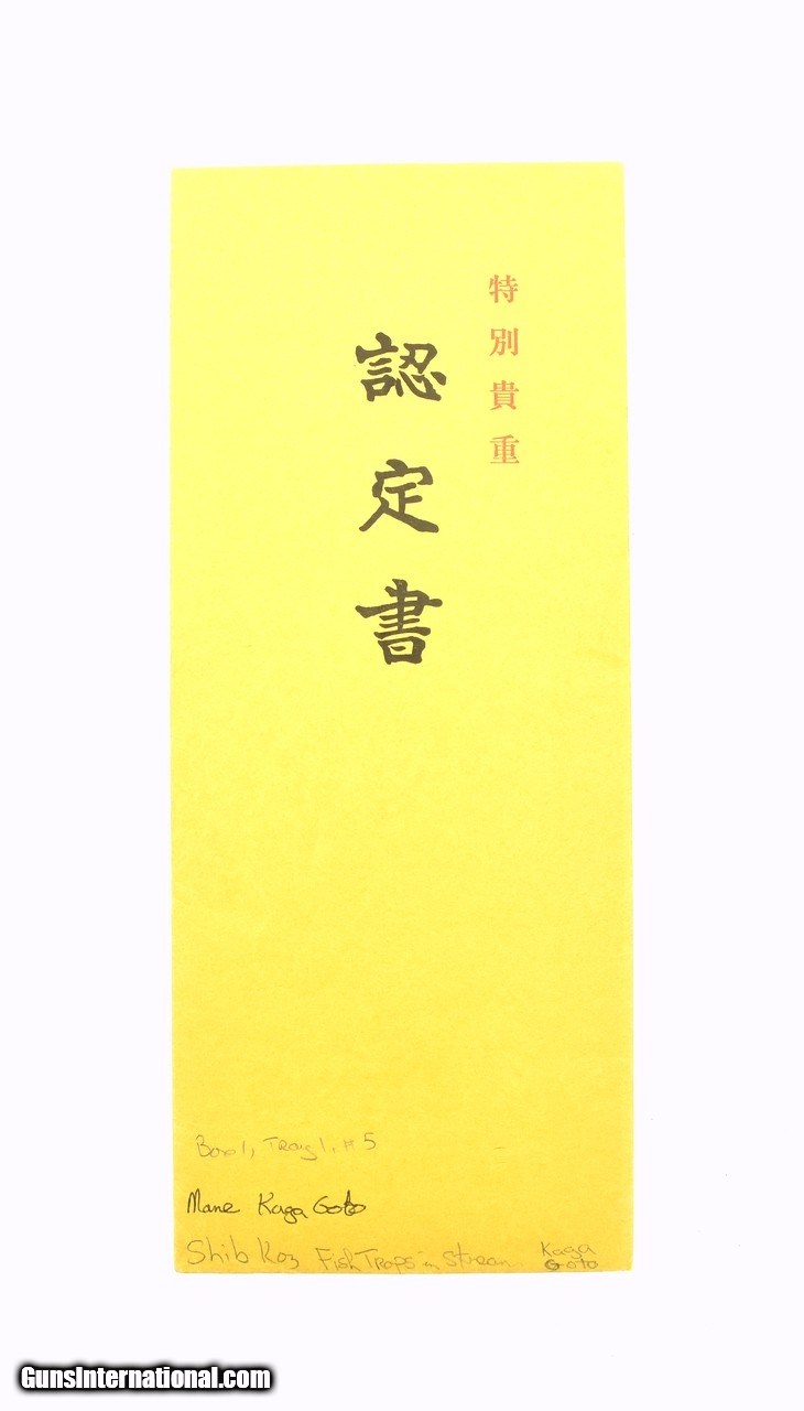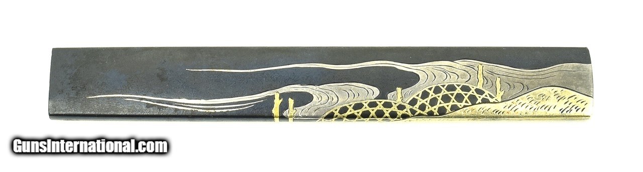 Description: "Kinko Kodzuka. Polished shakudo ground. Fish trap in stream with silver and gold highlights. Kaga Goto work with N.B.T.H.K. Certificate. Ex. Stanley Kellert Collection. SOLD |