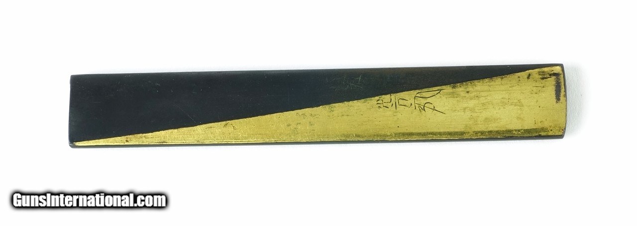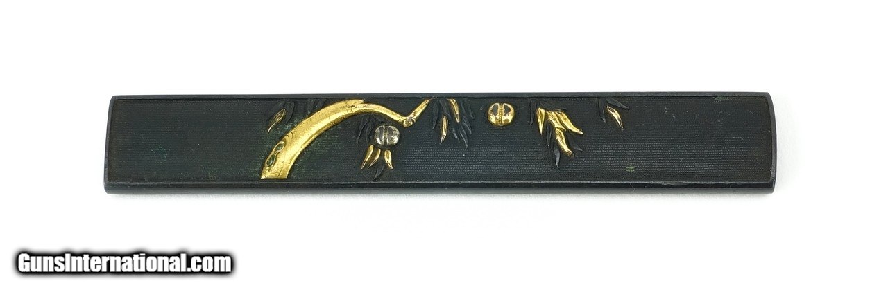 Description: "Kinko Kodzuka. Shakudo fine ground. Subject is bent tree with hanging fruit and leaves in gold and shakudo. Signed Goto Mitsu… with Kao. SOLD |