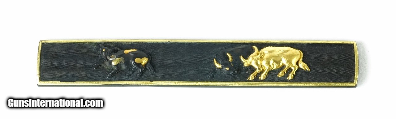 Description: "Kinko Kodzuka. Shakudo nanako ground. High relief oxen in gold, shakudo, and silver. Signed: Gotu Taka Yuki with Kao. Gold ox, shakudo ox and combination gold and shakudo ex. (Two small dents on edge). SOLD |
