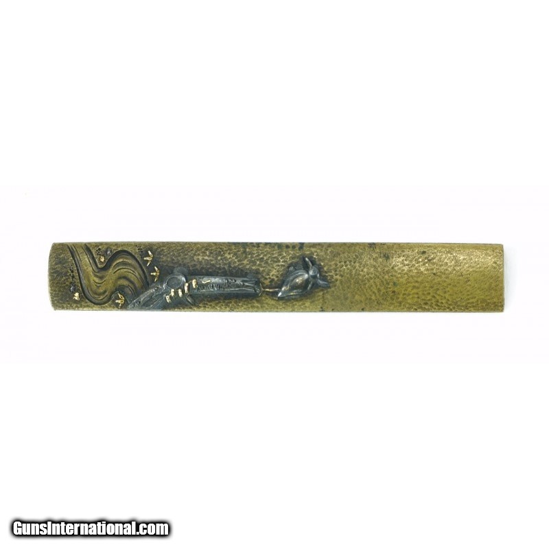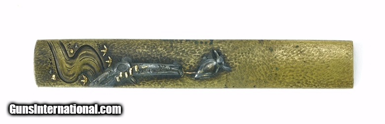 Description: "Kinko Kodzuka. Copper stone ground. Shakudo bird standing on small tree beside flowing stream. Gold and copper highlights. Signed with large Kao on reverse with cat-scratch striations. SOLD |