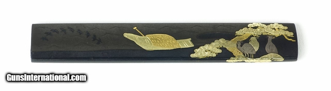 Description: "Kinko Kodzuka. Polished shadudo ground. Scene of birds sitting under a pine tree beside gold boat on shakudo water. Also in background is a flight of birds. Kaga work. Unsigned. Reverse has shakudo and gold. Elegant. SOLD |