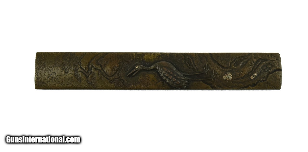Description: "Kinko Kodzuka. Textured copper ground. Motif of crane in stream with foliage in background. Gold highlights. Signed. SOLD |