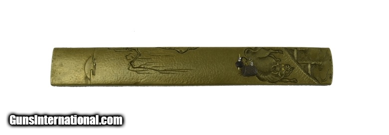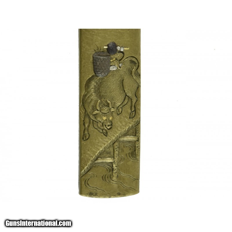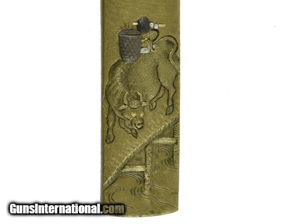 Description: "Kinko Kodzuka. Shibuichi stone ground finely carved ox bearing containers with shakudo and silver highlights. Ox is on bridge with setting sun in background. Signed: Naga Mitsu with Kao. SOLD |
