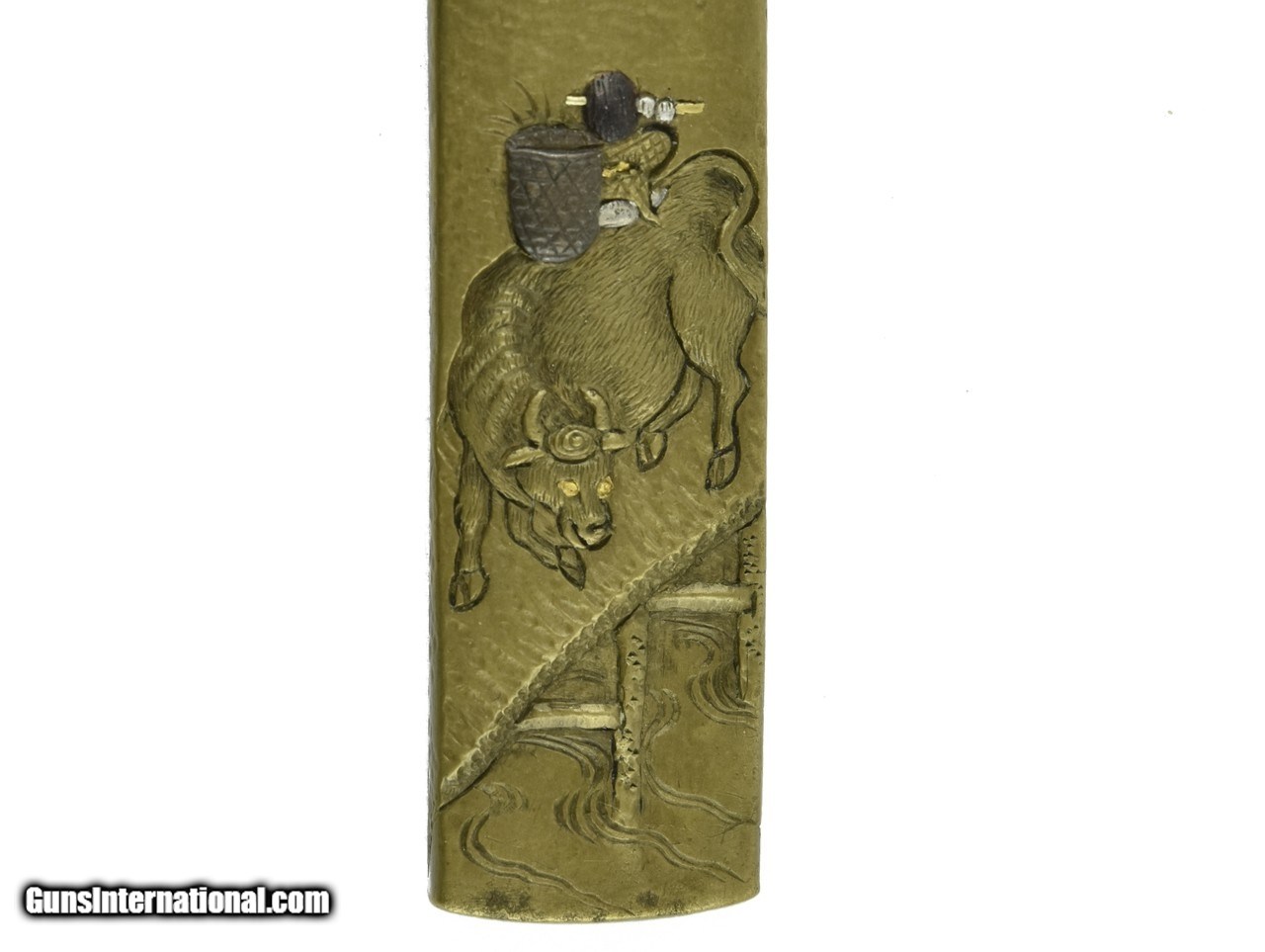 Description: "Kinko Kodzuka. Shibuichi stone ground finely carved ox bearing containers with shakudo and silver highlights. Ox is on bridge with setting sun in background. Signed: Naga Mitsu with Kao. SOLD |