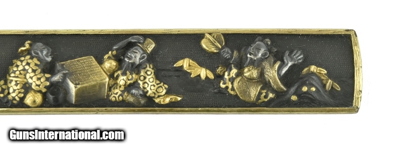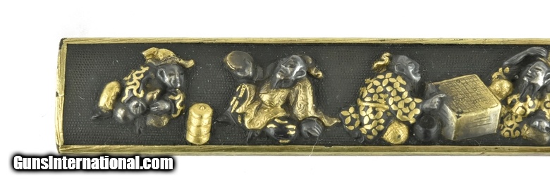 Description: "Kinko Kodzuka. Shakudo nanako ground. Five shakudo gold and silver figures, two of which are playing a game of go. Unsigned. SOLD |