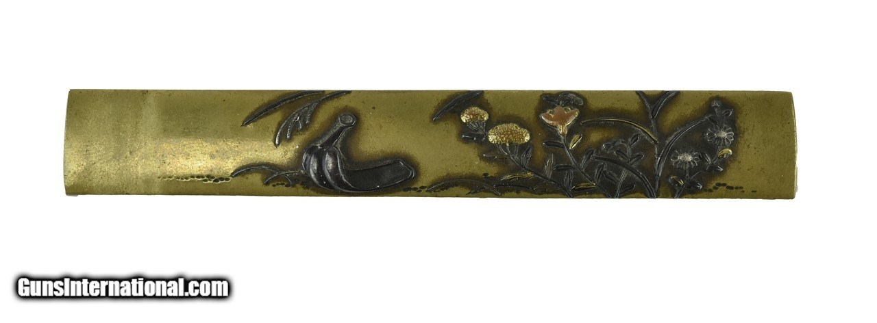 Description: "Kinko Kodzuka. Polished Sentoku ground. Shakudo stirrup and flowers of shakudo, gold, silver, and copper. Singed: Masa Toshi? SOLD |