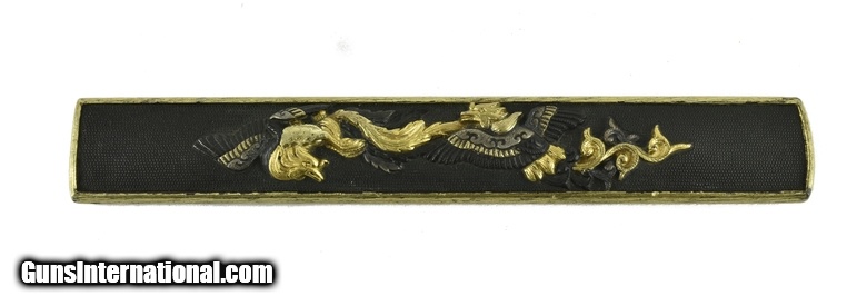 Description: "Kinko Kodzuka. Shakudo nanako ground. Design of high-relief phoenix birds in flight with gold, shakudo, and silver highlights. Reverse has gold cat-scratch pattern. Classic theme and well done. SOLD |