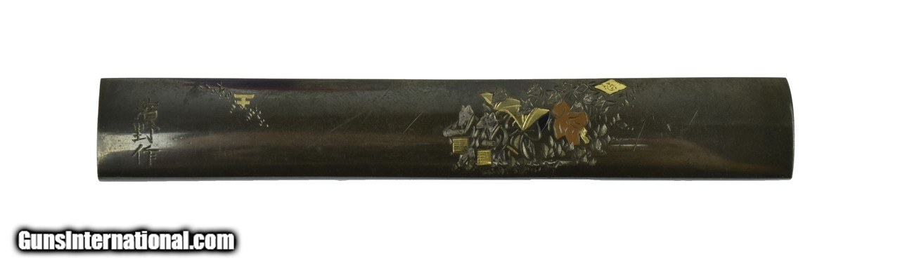 Description: "Kinko Kodzuka. Polished Shibuichi ground. Motif is procession of robed foxes with gold, silver, and copper highlights. Signed on obverse. Reverse has complex pattern of a matrix that appears like very fine marbling. SOLD |