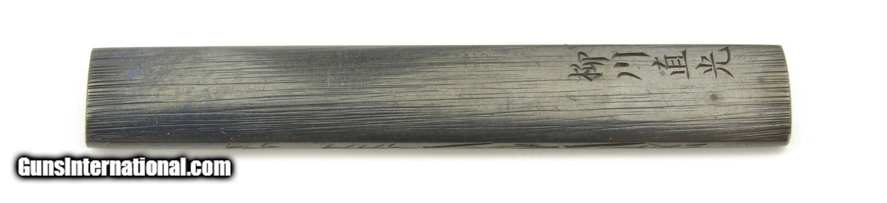 Description: "Kinko Kodzuka. Polished shakudo ground. Figure standing on wooden barrel stirring liquid while glancing at the moon above. Signed: Yanagawa Nao Mitsu. 1733-1809. Became fourth heritary master. Baur, P. 391. SOLD |