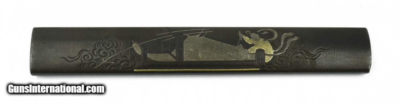 Description: "Kinko Kodzuka. Gold robed figure working loom with silver highlights. Unsigned. SOLD |