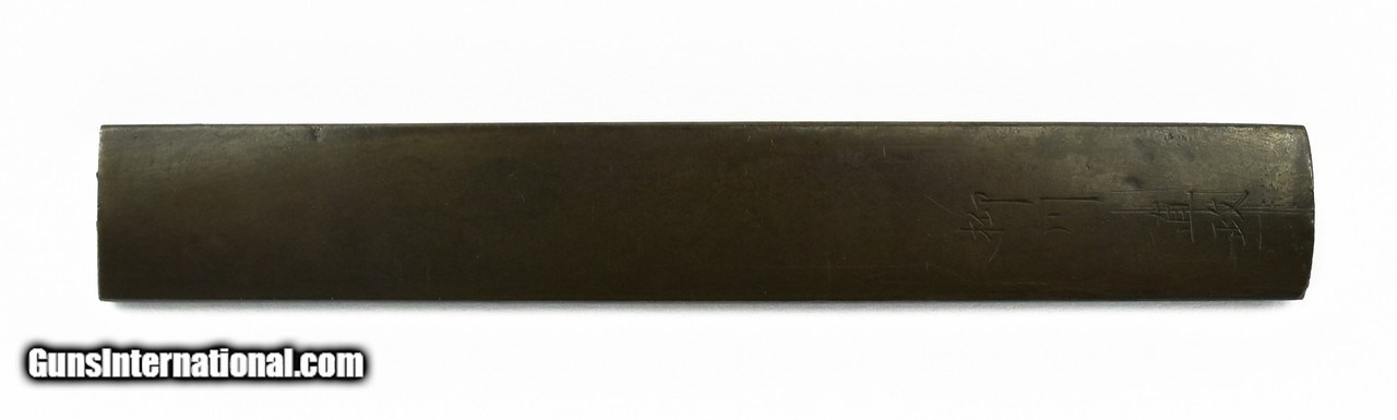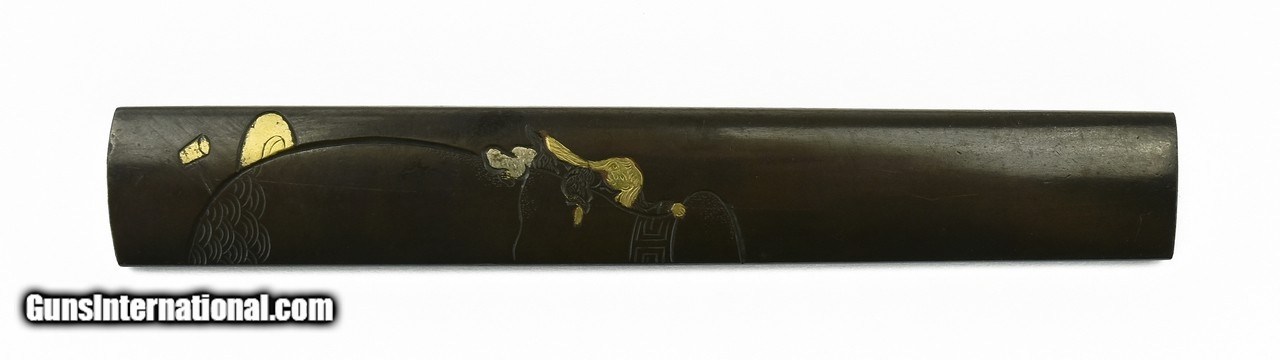 Description: "Kinko Kodzuka. Polished shakudo ground. Motif of child climbing container with gold and silver highlights. Signed: Yanagawa Nao Masa (1692-1757). Ref: Baur, P. 405. Became 2nd Hereditary Yanagawa Master. SOLD |
