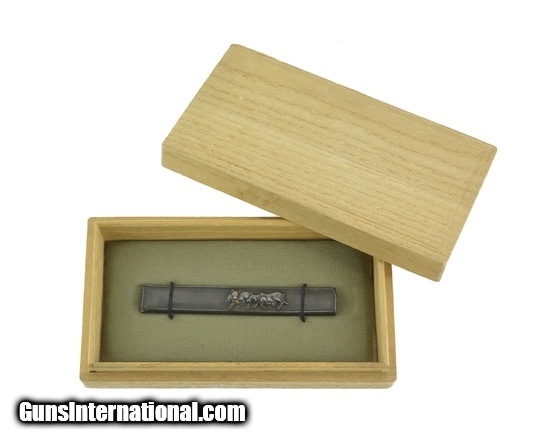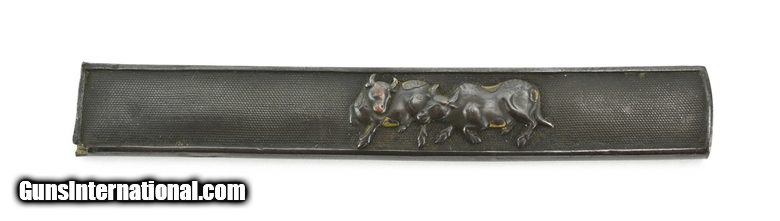 Description: "Kinko Kodzuka. Kinko Kodzuka with shakudo oxen and gold highlights. Throat is damaged and shakudo Nanako ground shows wear. Possibly Ko-Mino. Boxed. Unsigned. SOLD |