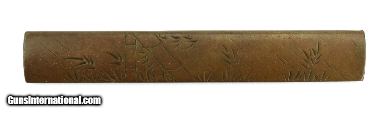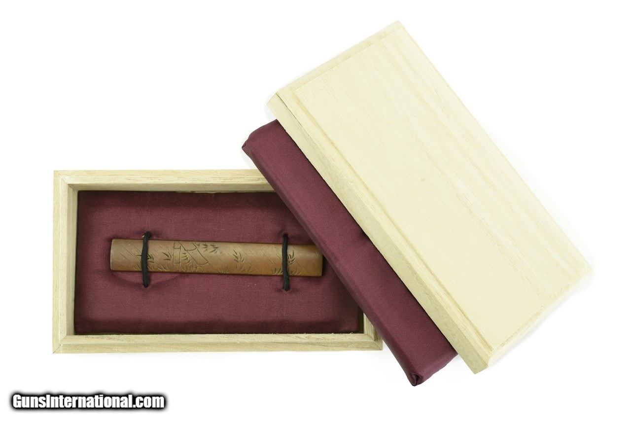 Description: "Kinko Kodzuka. Polished copper ground. Theme of bamboo with rain. Signed: Mune Teru (Kao). Boxed. SOLD |