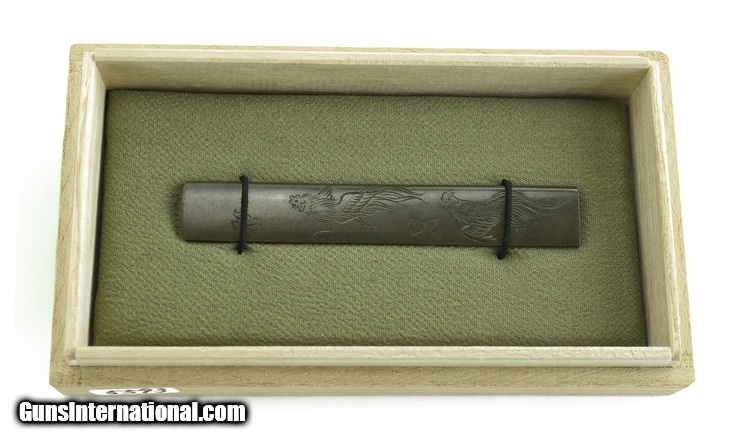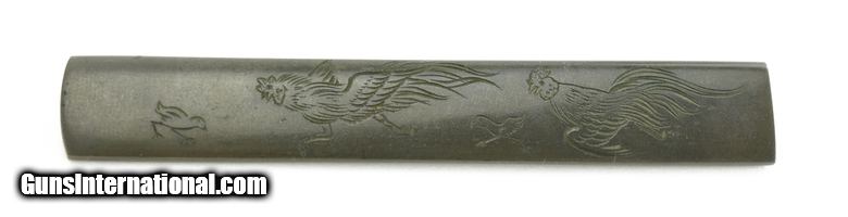 Description: "Kinko Kodzuka. Polished Shibuichi. Running roosters with chicks. Reverse is polished copper. Signed: Yoshi Kane with Kao. SOLD |