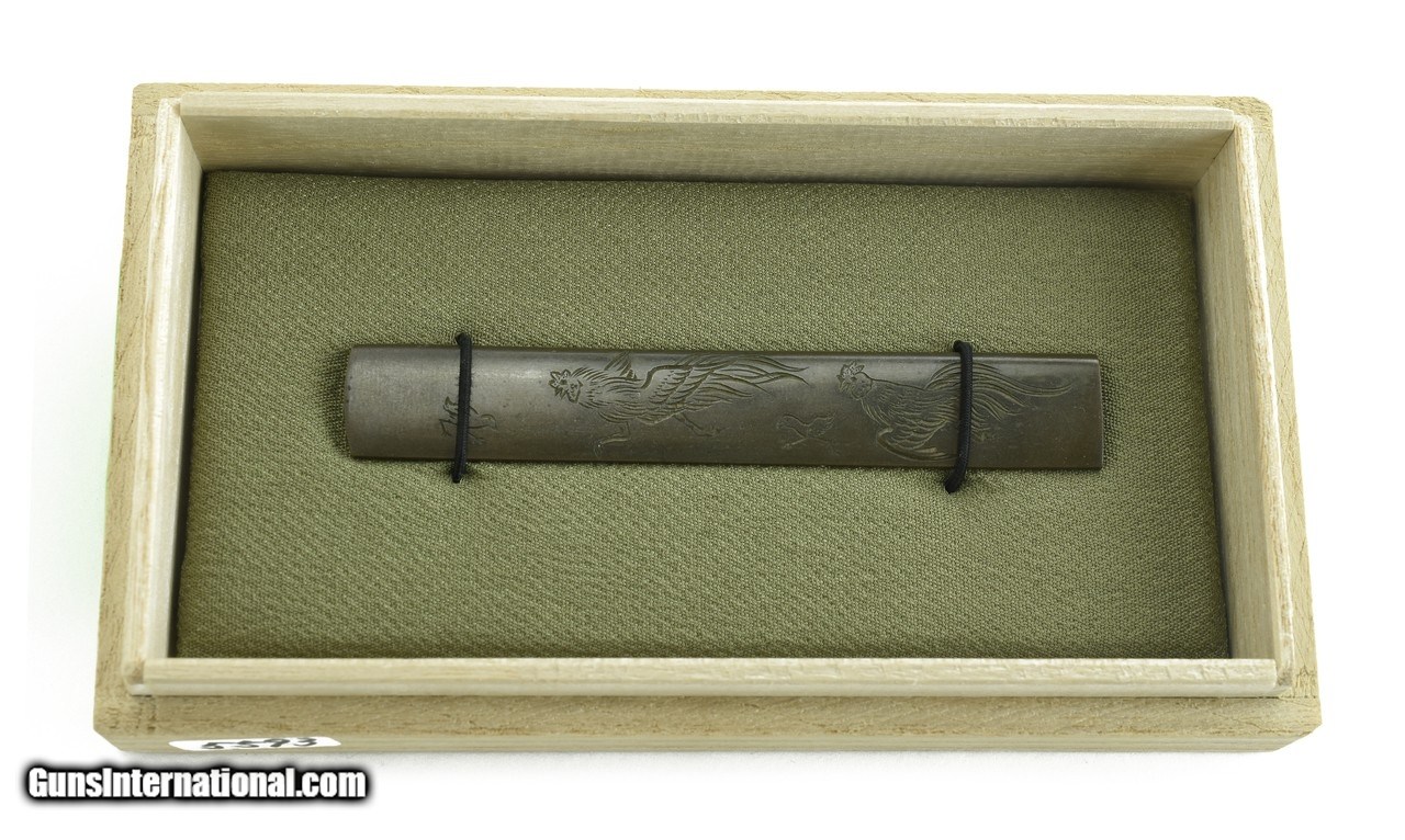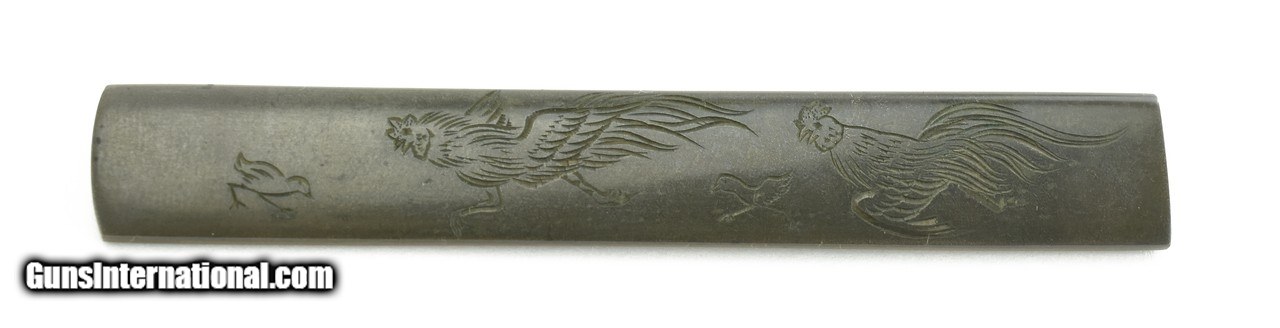 Description: "Kinko Kodzuka. Polished Shibuichi. Running roosters with chicks. Reverse is polished copper. Signed: Yoshi Kane with Kao. SOLD |