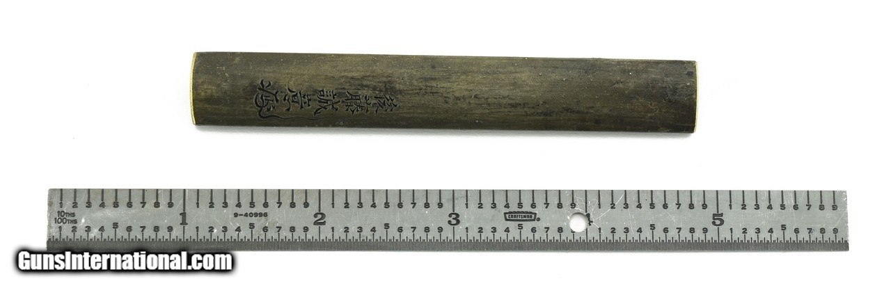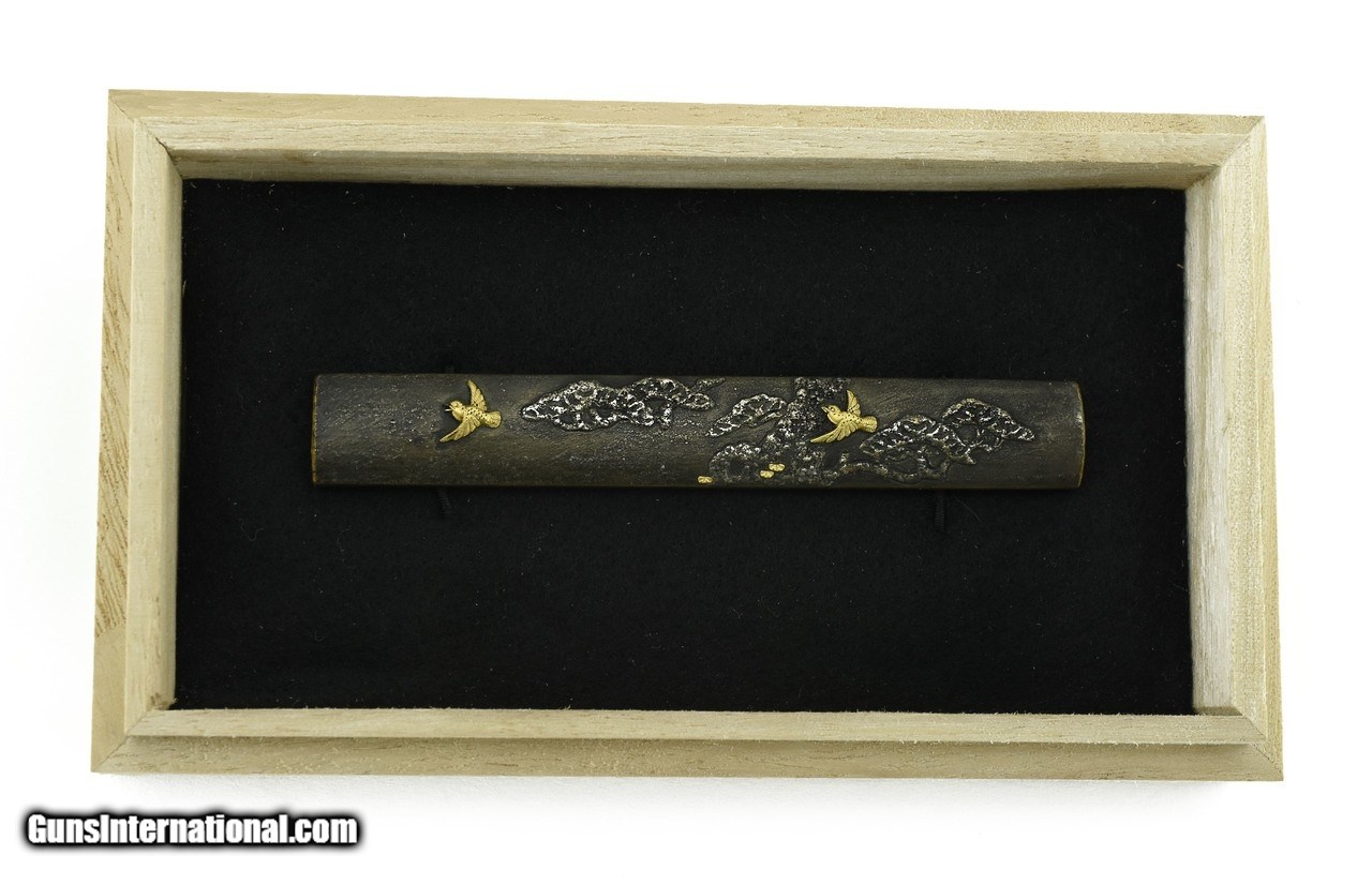 Description: "Kinko Kodzuka. Ishime shibuichi ground. Gold birds in flight around silver trees. Signed with Kao. Unusual finish work. SOLD |