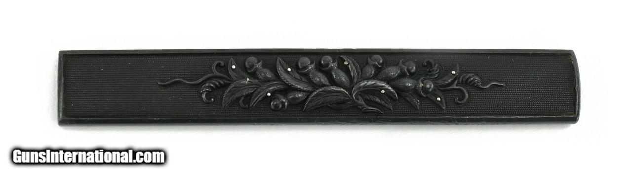 Description: "Kinko Kodzuka. Fruit and leaves on shakudo nanako ground. Very well done. Reverse has some small dings and a dent. Possibly Ko-Mino. With box. SOLD |