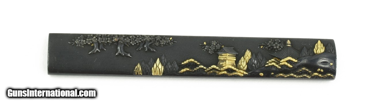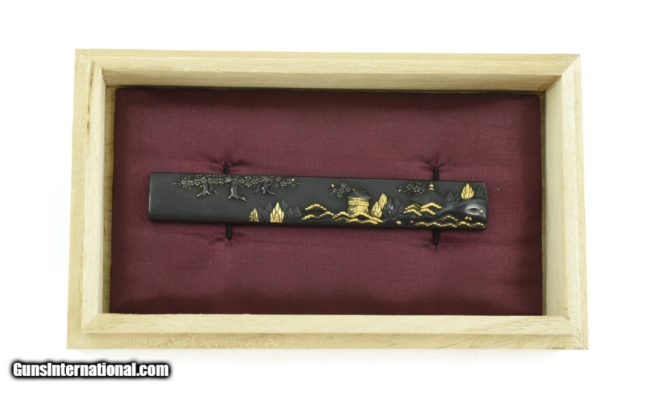 Description: "Kinko Kodzuka. Shakudo nanako ground. Houses with trees and foliage with gold highlights. Unsigned. Boxed. Very nice detail. SOLD |
