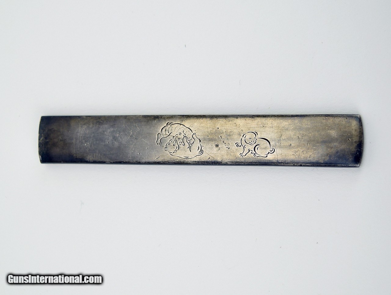 Description: "Kinko Kodzuka tarnished silver ground. Reverse has cat scratch pattern. Two dogs playing with third dog watching. No signature. SOLD |