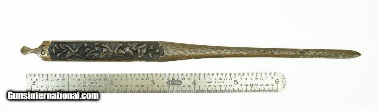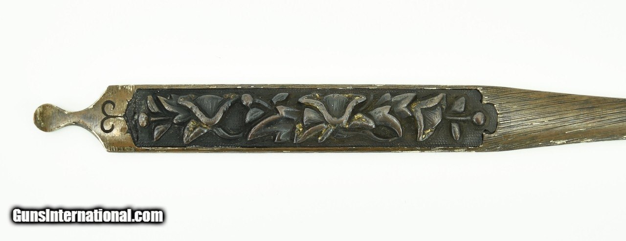 Description: "Kinko Kogai. Subject matter is deeply carved designs against Shakudo ground. Body of Kogai is copper with traces of silver plate remaining. Signed: Goto Mitsu Mori (Goto Keijo 1751-1804). SOLD |