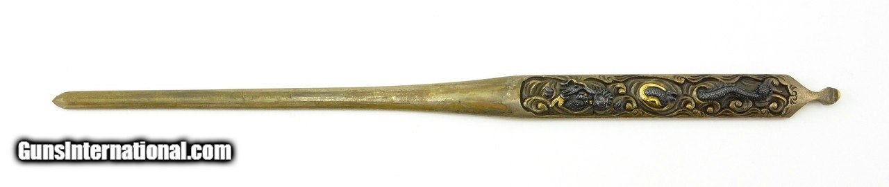 Description: "Kinko Kogai. Shibuichi shakudo dragon with gold highlights dipping in and out of waves. Reverse is finely textured striations. Mumei (unsigned). SOLD |