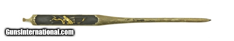 Description: "Kinko Kogai. Archery motif on shakudo nanako ground. Silver gilt with some flaking. Missing some plated finish on the shaft. Main part has all its finish. Bow, arrows and quiver. Unsigned. SOLD |
