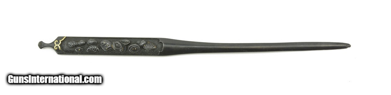 Description: "Kinko Kogai. Shakudo with various sea shells with gold highlights. Unusual subject matter in high relief on stone ground. This Kogai is near excellent overall condition with some very tiny nicks on the reverse. Unsigned. SOLD |