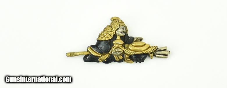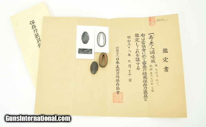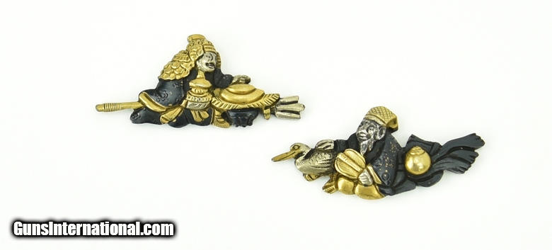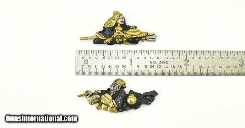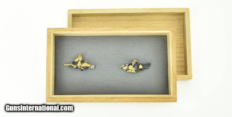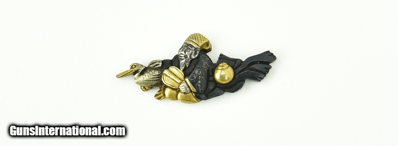 Description: "Kinko Menuki. Gold, silver and Shakudo. Motif of duck and figure with vessels. Excellent condition. SOLD |