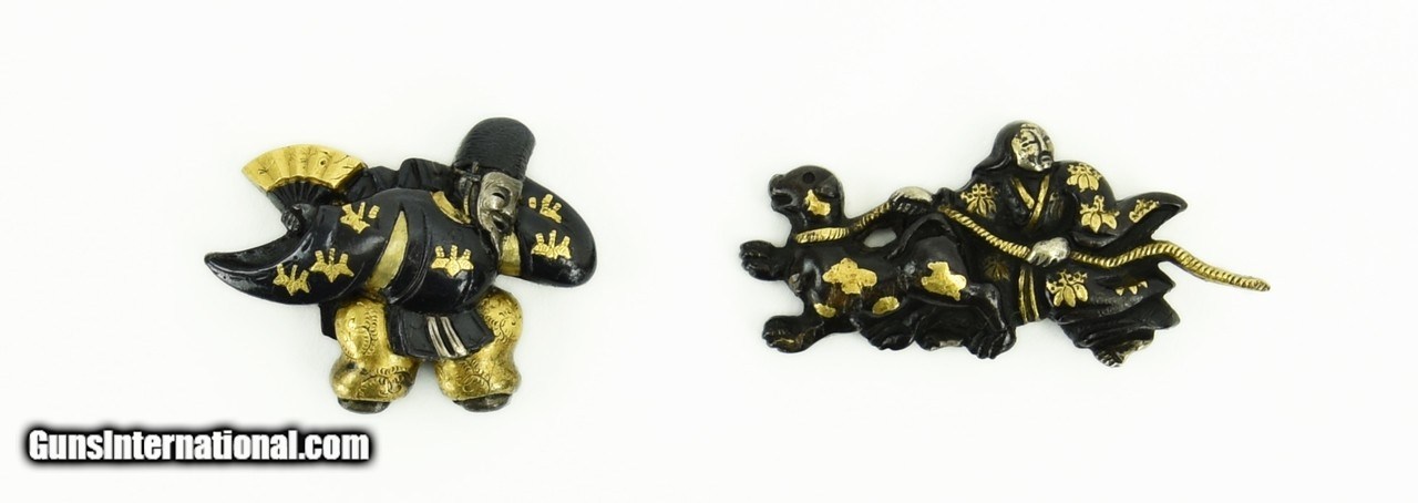 Description: "Kinko Menuki. Shakudo figure with gold highlights holding gold fan; other robed figure has dog on leash. Signed with kao. SOLD |