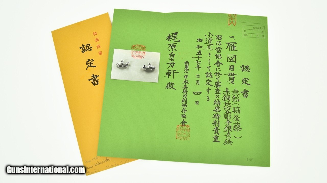 Description: "Kinko Menuki. Shakudo Geese with Shibuichi bodies and gold highlights. Comes with N.B.T.H.K certificate. Tanto sized. Waki Goto branch of mainline Goto. Unsigned. SOLD |