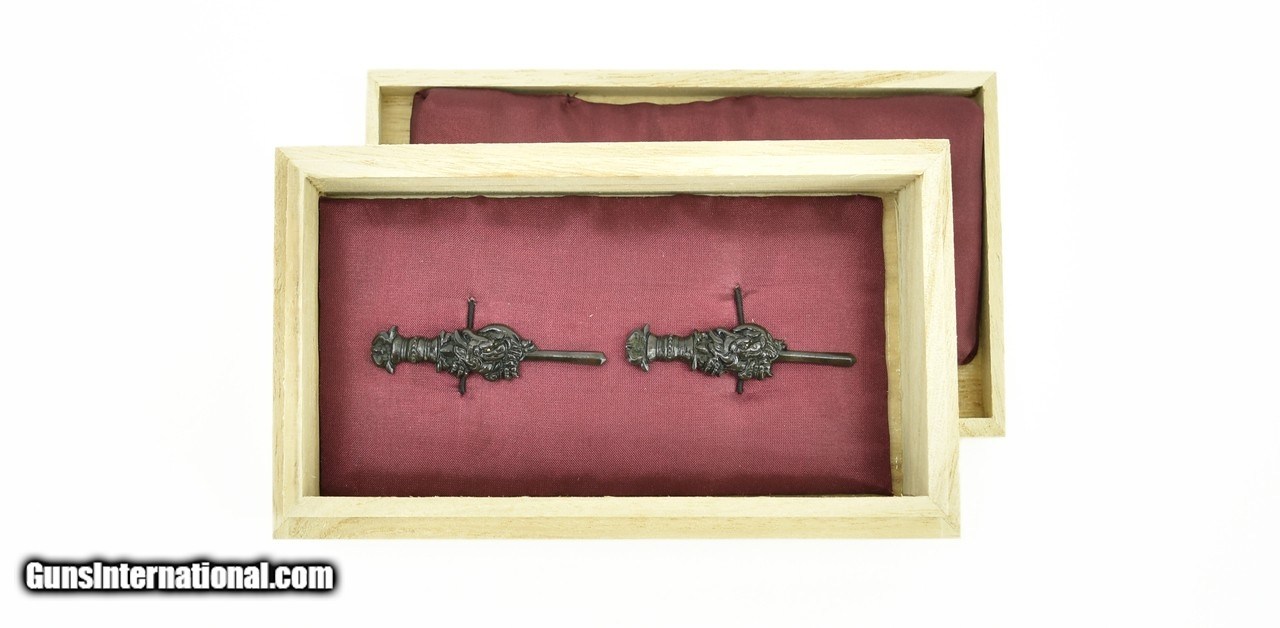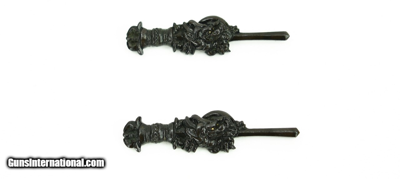 Description: "Kinko Menuki. Shakudo Dragons on Ken Swords. Dragons have gold eyes. Excellent condition. SOLD |
