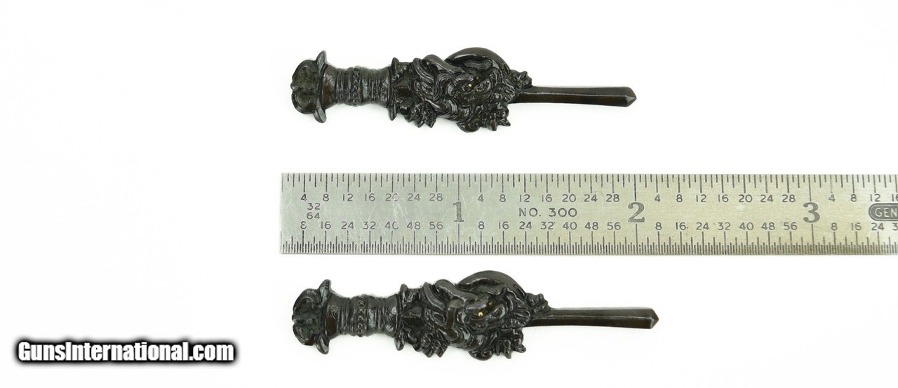 Description: "Kinko Menuki. Shakudo Dragons on Ken Swords. Dragons have gold eyes. Excellent condition. SOLD |