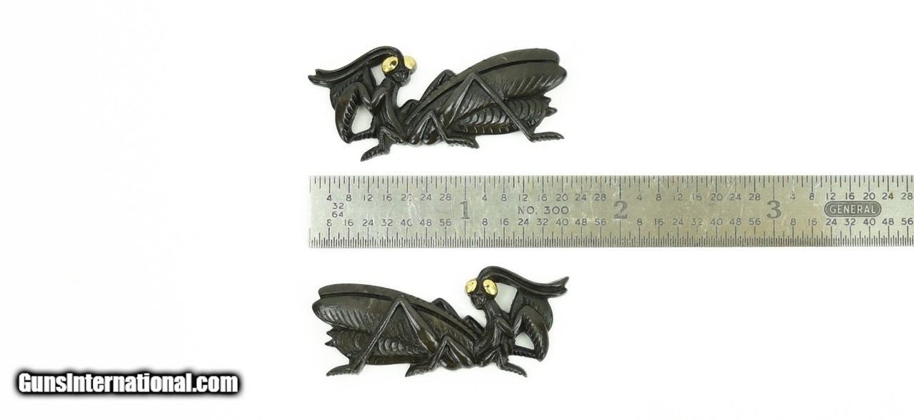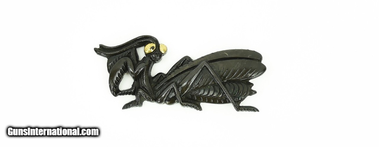 Description: "Kinko Menuki. Large Shakudo. Mantis with gold eyes. Unusual. SOLD |
