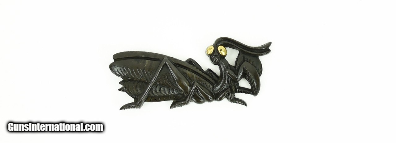 Description: "Kinko Menuki. Large Shakudo. Mantis with gold eyes. Unusual. SOLD |