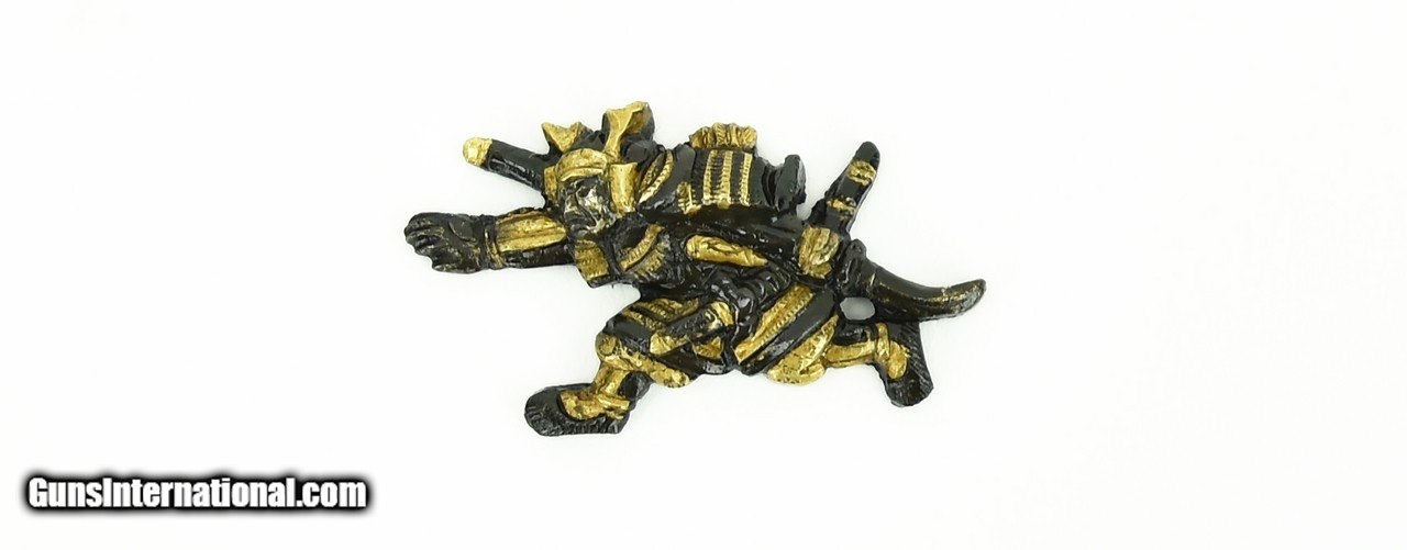 Description: "Kinko Menuki. Samurai Warriors in Armor. Gold, silver, and Shakudo highlights. SOLD |