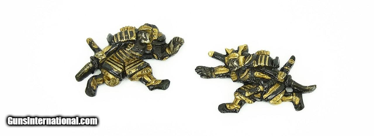 Description: "Kinko Menuki. Samurai Warriors in Armor. Gold, silver, and Shakudo highlights. SOLD |