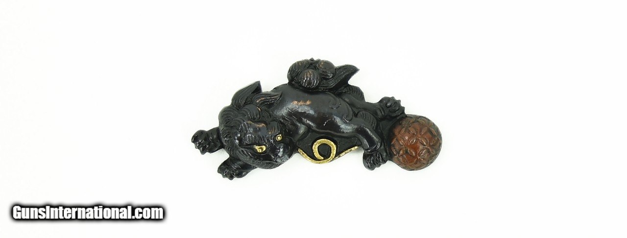 Description: "Kinko Menuki. Shakudo Shi-Shi tied to copper ball with gold highlights. Unsigned Wakizashi sized. SOLD |