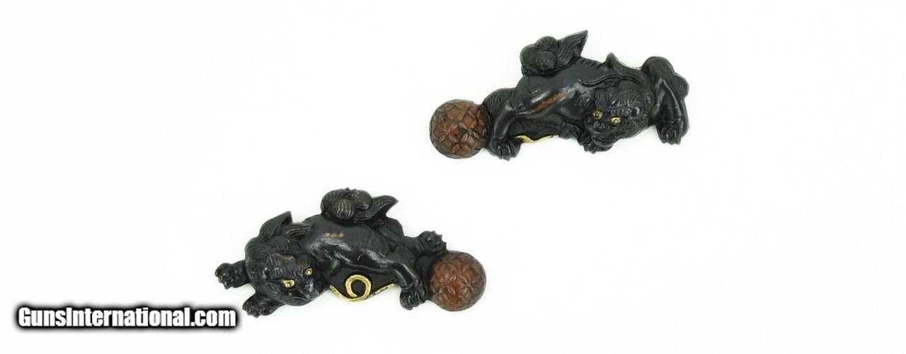 Description: "Kinko Menuki. Shakudo Shi-Shi tied to copper ball with gold highlights. Unsigned Wakizashi sized. SOLD |
