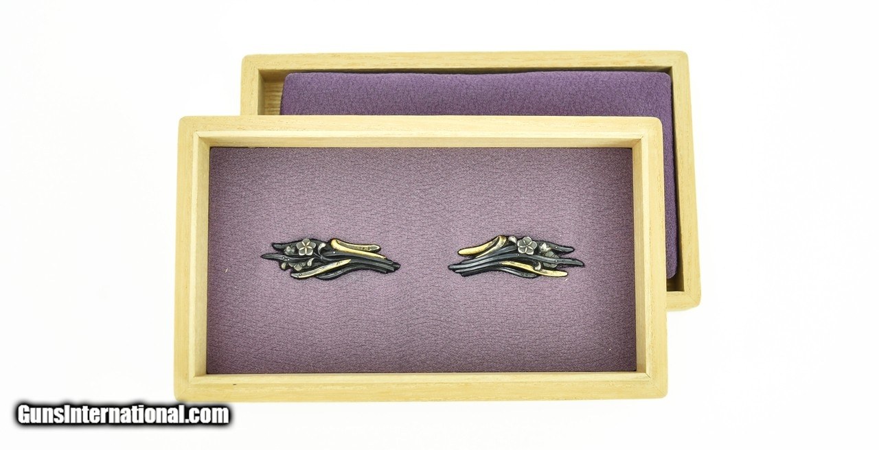 Description: "Kinko Menuki. Blooming Iris motif. Gold, silver, and Shakudo. Unsigned. Custom box. Excellent condition. SOLD |