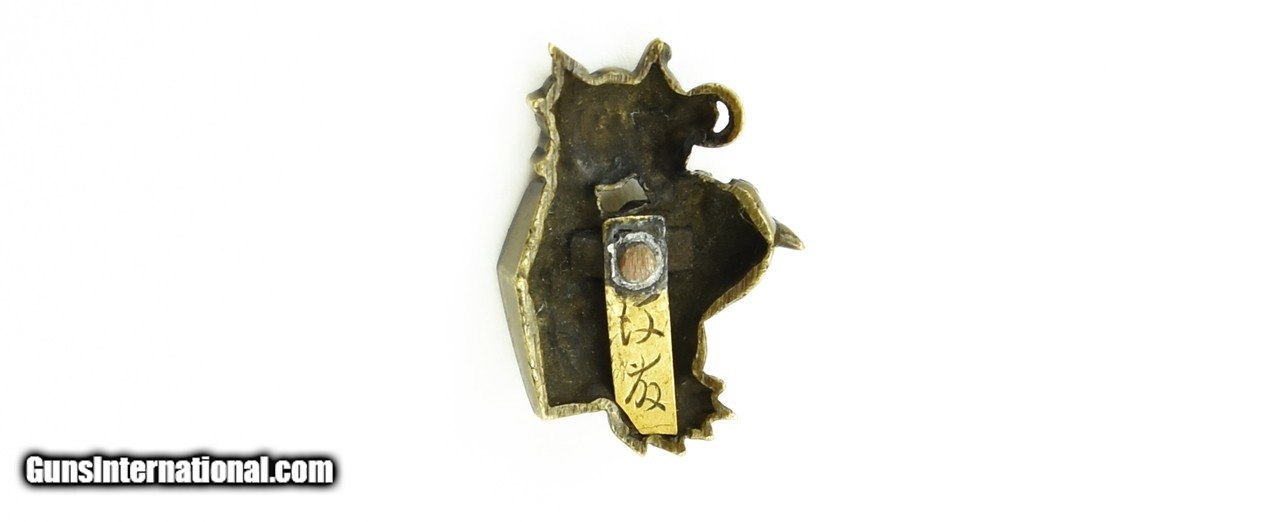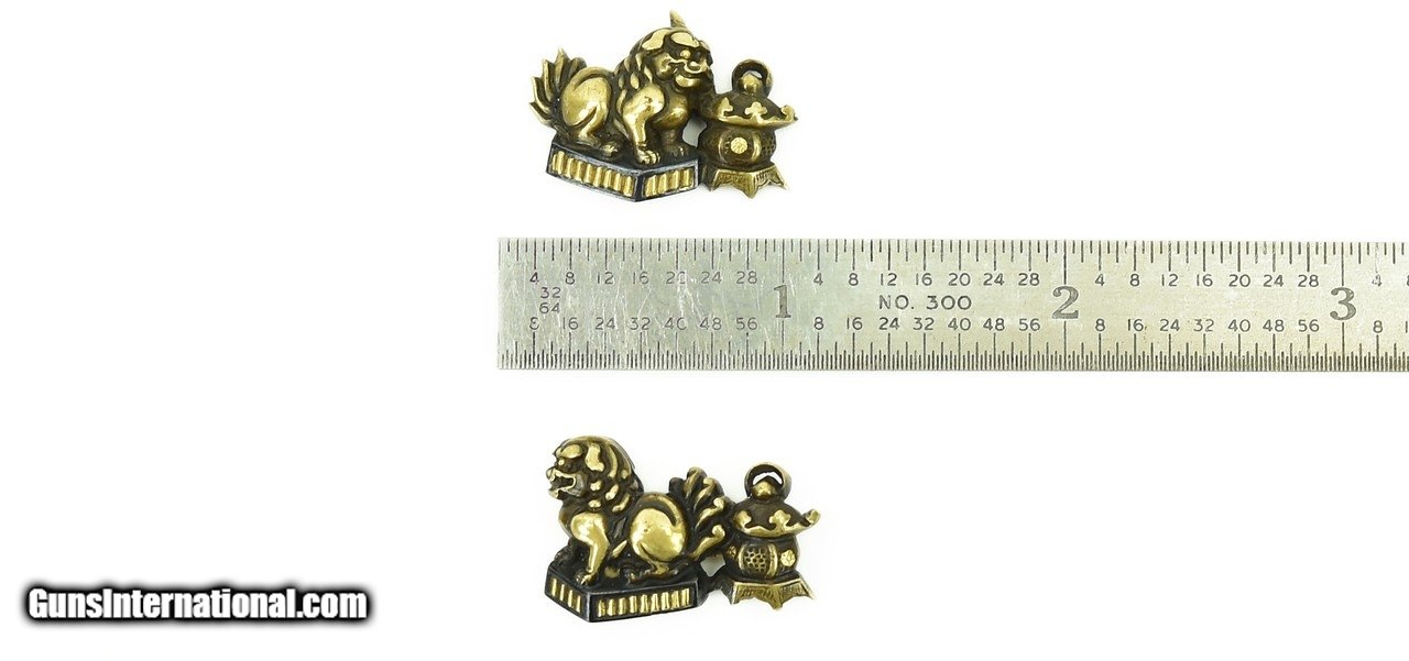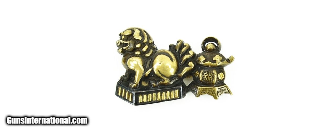 Description: "Kinko Menuki. Shi-Shi on plinth with lantern. Signed: Goto with Kao. Gold highlights on Shakudo. Excellent condition. SOLD |