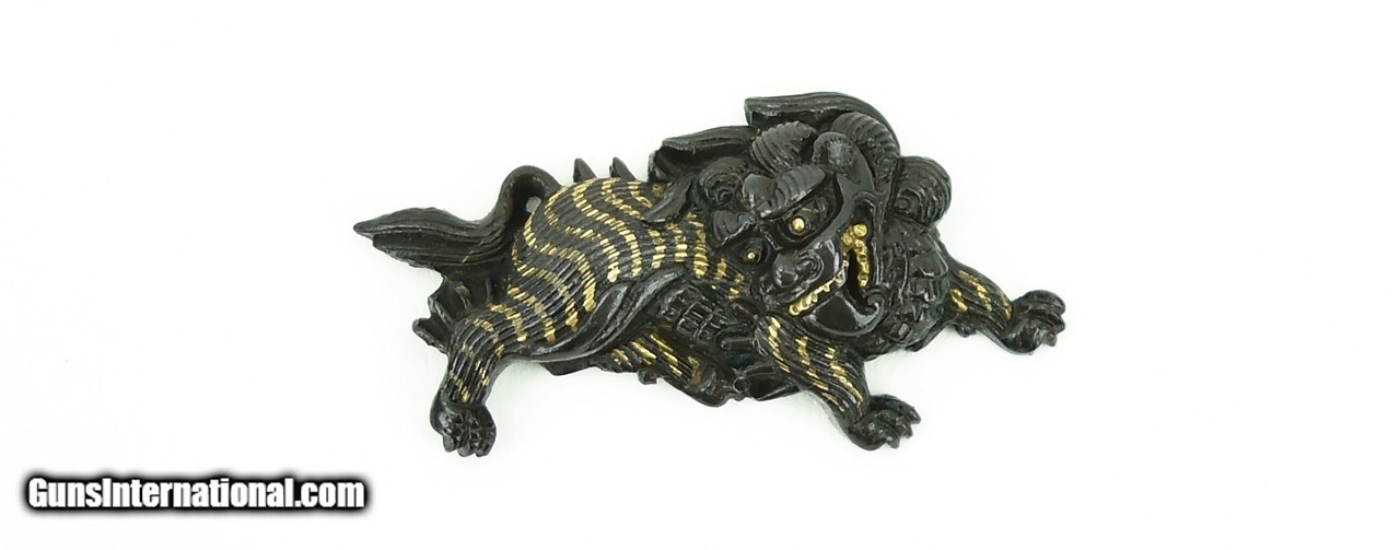 Description: "Kinko Menuki. Shakudo Shi-Shi with gold stripes. Very detailed with tongue and teeth visible. SOLD |