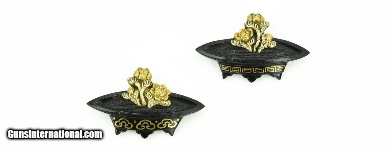 Description: "Kinko Menuki. Flowers on Jardinere. Shakudo and gold. Signed: Nakajima Haru Teru Yanagawa School. Mid-19th Century. Lived in Edo to the age of 76. SOLD |