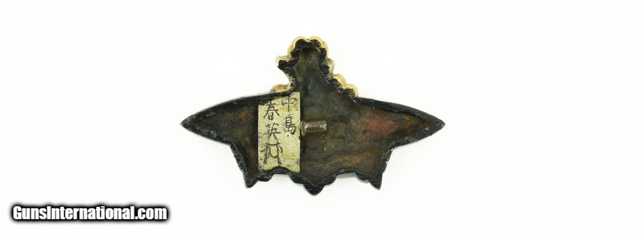 Description: "Kinko Menuki. Flowers on Jardinere. Shakudo and gold. Signed: Nakajima Haru Teru Yanagawa School. Mid-19th Century. Lived in Edo to the age of 76. SOLD |