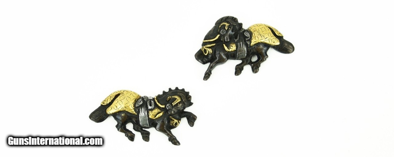 Description: "Kinko Menuki. Shakudo horses with shibuichi saddles. Horses reins and saddle blanket are gold. Unsigned. Fine workmanship. SOLD |