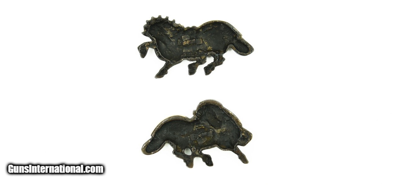 Description: "Kinko Menuki. Shakudo horses with shibuichi saddles. Horses reins and saddle blanket are gold. Unsigned. Fine workmanship. SOLD |
