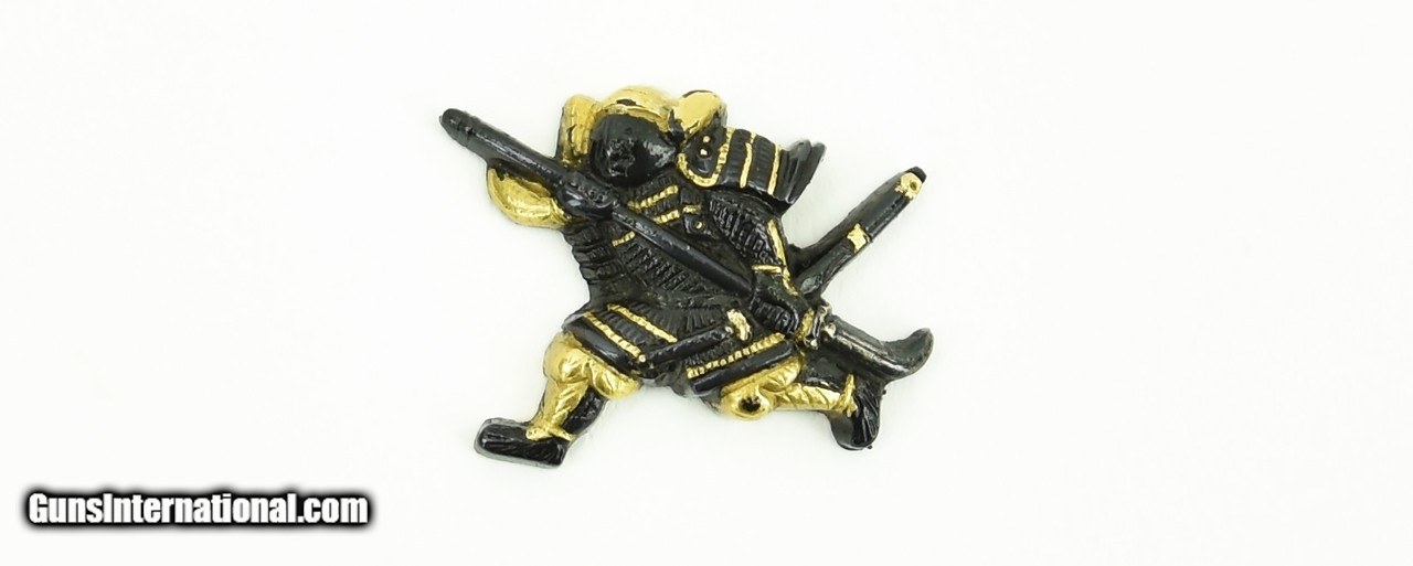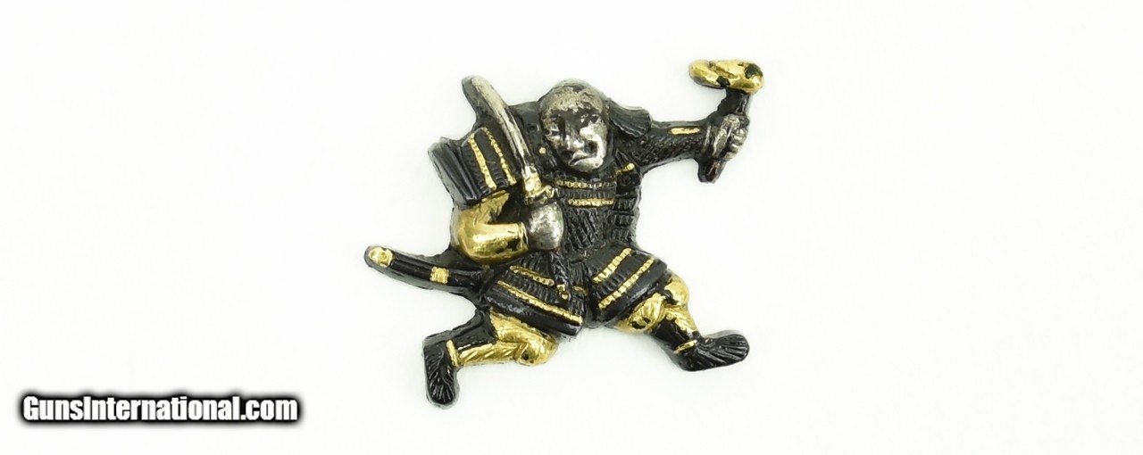 Description: "Kinko Menuki. Samurai with Naginata and Katana. Silver gold and shakudo highlights. Tanto size. SOLD |