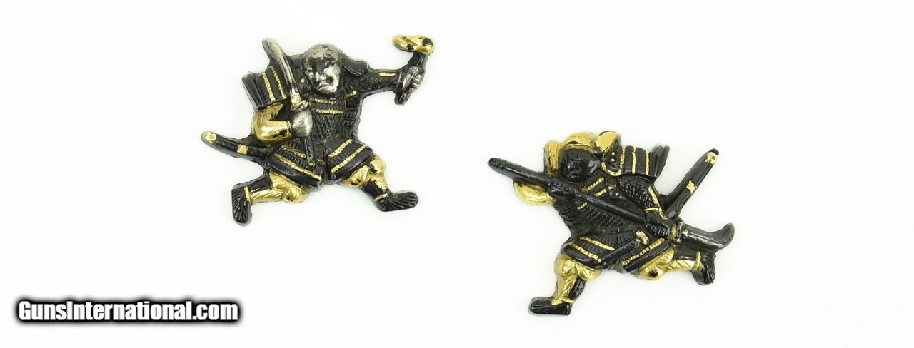Description: "Kinko Menuki. Samurai with Naginata and Katana. Silver gold and shakudo highlights. Tanto size. SOLD |