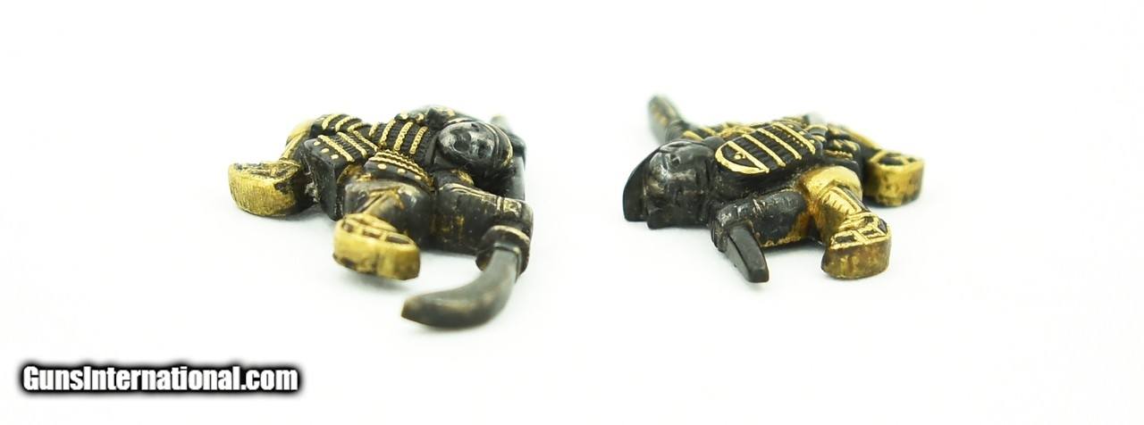 Description: "Kinko Menuki. Samurai with Naginata, and other samurai with arrow quiver highlighted in gold and silver. Excellent condition. SOLD |